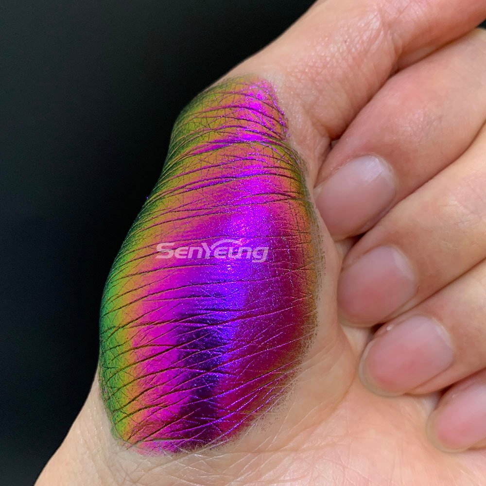This high bright color shifting chameleon pigment shows strong color changing effect, with colorful iridescent and high-density coating technology, it has excellent durability and moisture resistance, and the color is more shiny, which enhances the visual effect