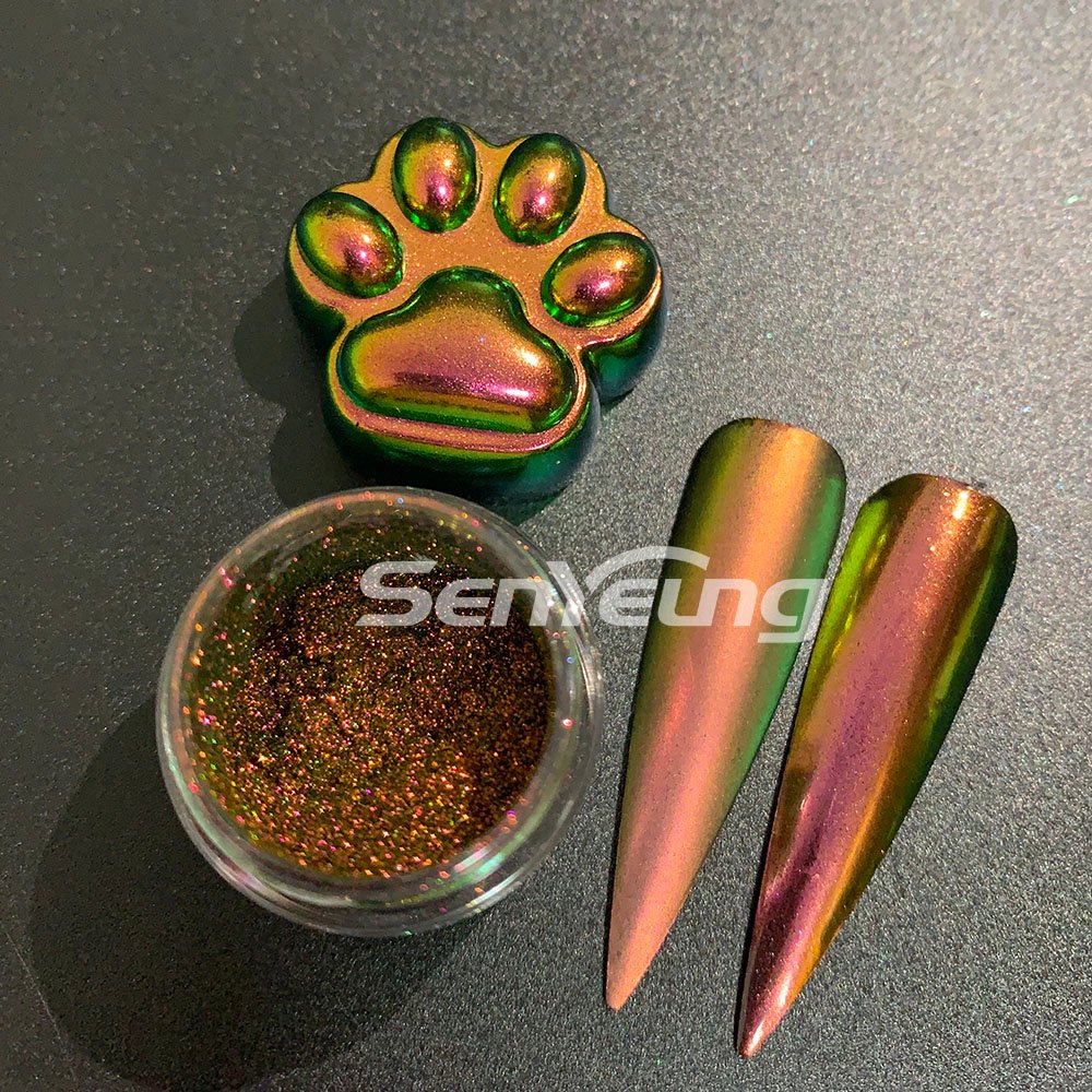 This high bright color shifting chameleon pigment shows strong color changing effect, with colorful iridescent and high-density coating technology, it has excellent durability and moisture resistance, and the color is more shiny, which enhances the visual effect