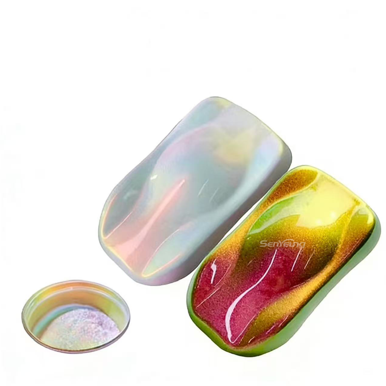 This high bright color shifting aurora pigment shows strong color changing effect, with colorful iridescent and high-density coating technology, it has excellent durability and moisture resistance, and the color is more shiny, which enhances the visual effect